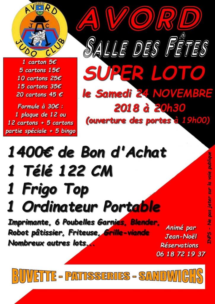 SUPER LOTO14 novembre , 2018 Calendrier Quand : 24 novembre 2018 @ 20 h 30 min2018-11-24T20:30:00+01:002018-11-24T20:45:00+01:00Où : Salle des FêtesContact : Avord Judo Club 06 18 72 19 37