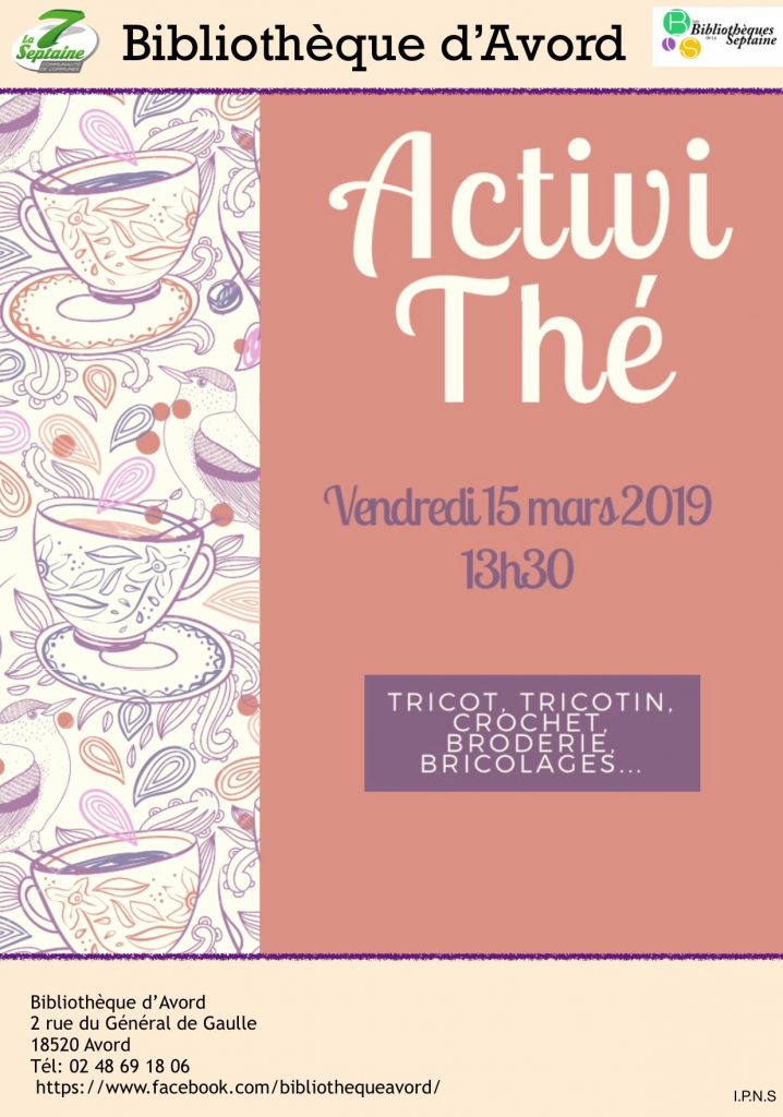 Activithé6 mars , 2019 Calendrier Quand : 15 mars 2019 @ 13 h 30 min2019-03-15T13:30:00+01:002019-03-15T13:45:00+01:00Où : Bibliothèque rue du Général de GaulleCoût : GratuitContact : Bibliothèque d'Avord 0248691806
