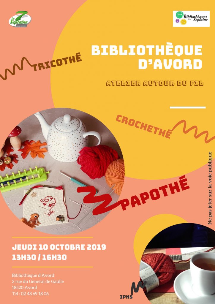 Atelier autour du fil30 septembre , 2019 Calendrier Quand : 10 octobre 2019 @ 13 h 30 min2019-10-10T13:30:00+02:002019-10-10T13:45:00+02:00Où : Bibliothèque 2 rue du Général de GaulleCoût : GratuitContact : Bibliothèque 02.48.69.18.06