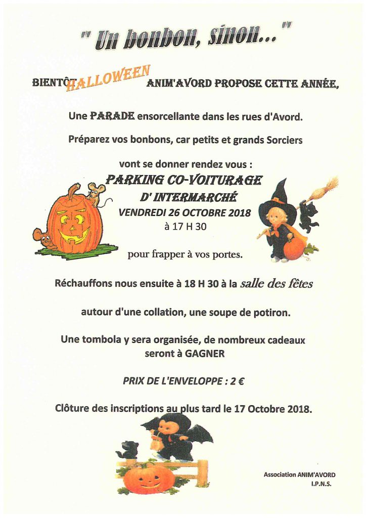 HALLOWEEN23 octobre , 2018 Calendrier Quand : 26 octobre 2018 @ 17 h 30 min2018-10-26T17:30:00+02:002018-10-26T17:45:00+02:00Où : RDV parking co-voiturage d'Intermarché 2 rue Agnès SorelContact : Anim'Avord