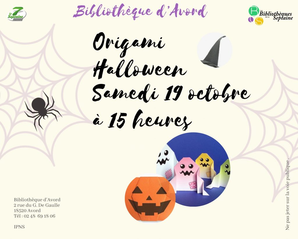 Origami Halloween14 octobre , 2019 Calendrier Quand : 19 octobre 2019 @ 15 h 00 min2019-10-19T15:00:00+02:002019-10-19T15:15:00+02:00Où : Bibliothèque 2 rue du Général de GaulleCoût : GratuitContact : Bibliothèque 02.48.69.18.06