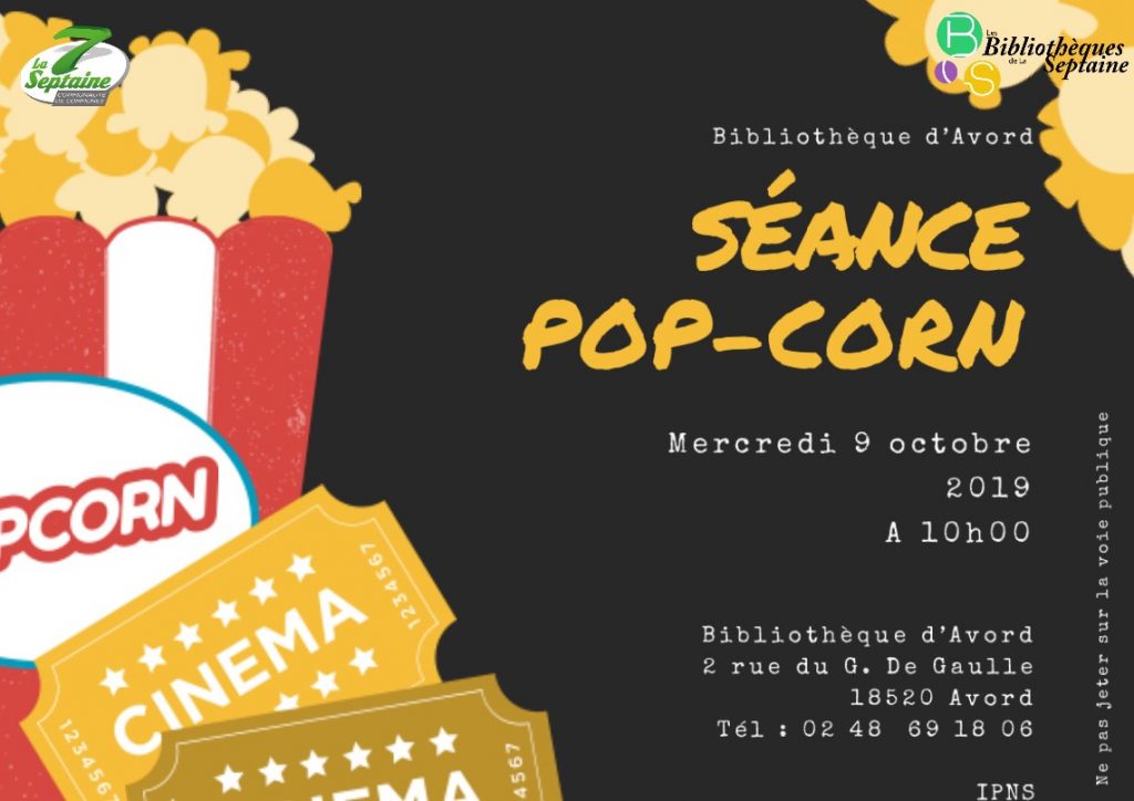 Séance pop-corn30 septembre , 2019 Calendrier Quand : 9 octobre 2019 @ 10 h 00 min2019-10-09T10:00:00+02:002019-10-09T10:15:00+02:00Où : Bibliothèque 2 rue du Général de GaulleCoût : GratuitContact : Bibliothèque 02.48.69.18.06